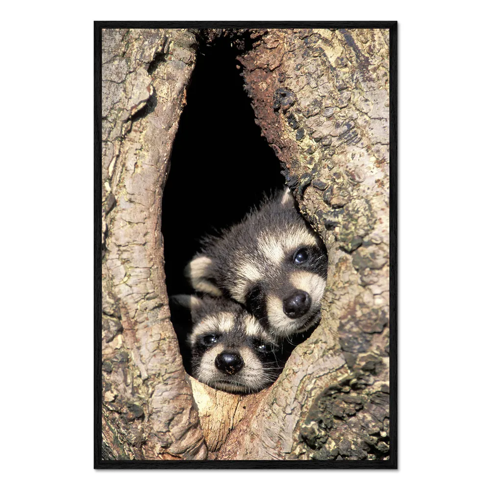 تابلو قاب دار طرح Baby raccoons in the tree cave کد 260422